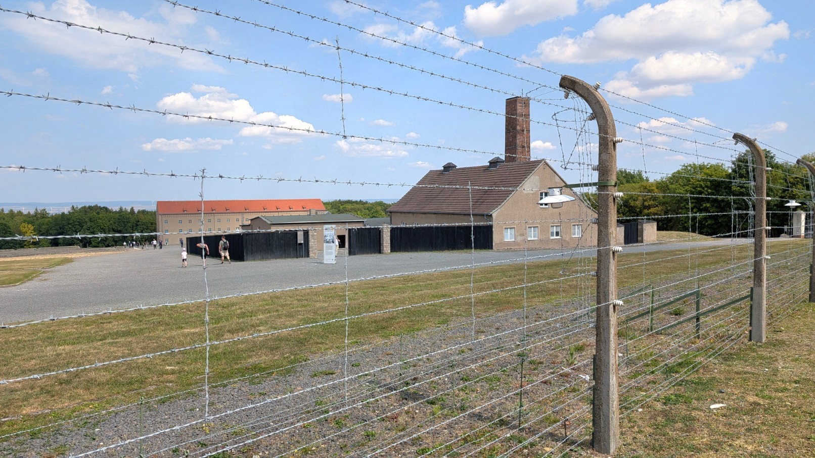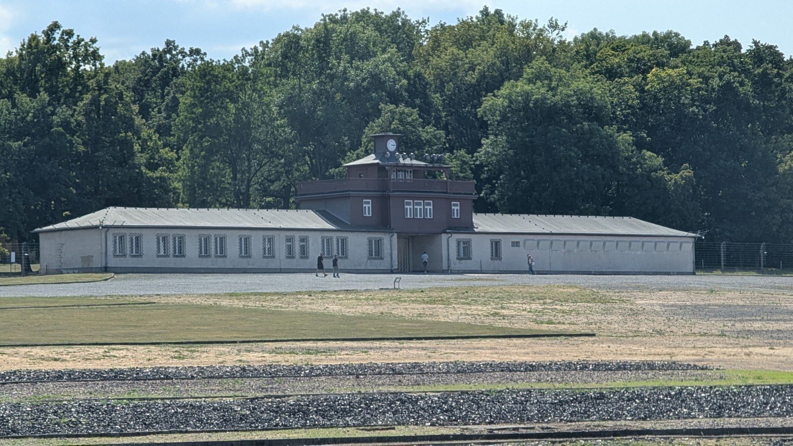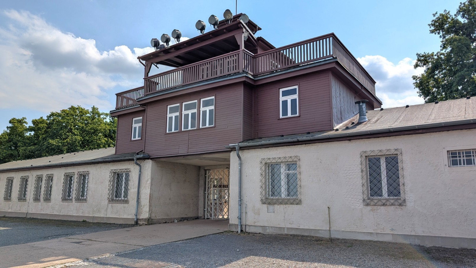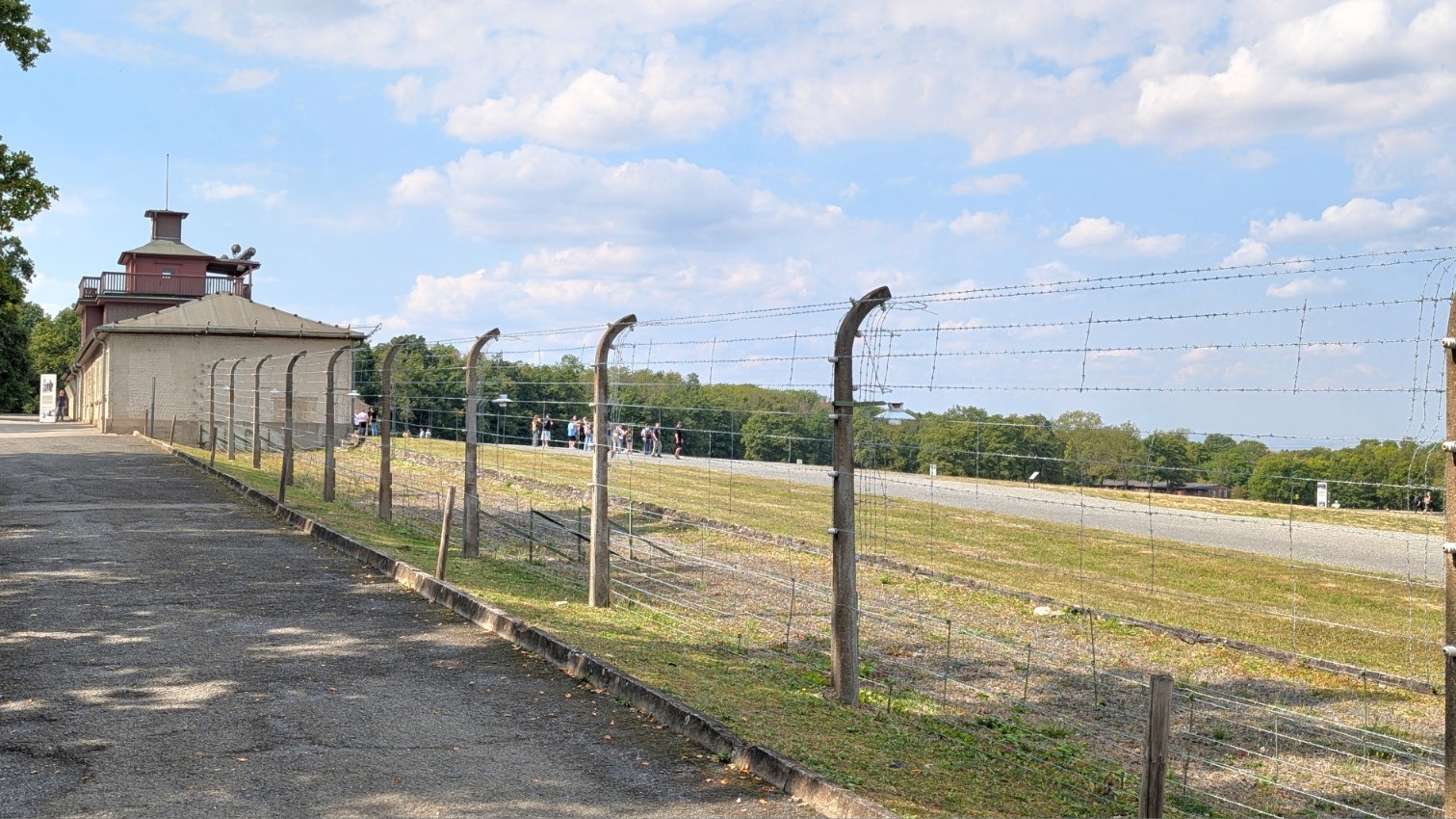 Das gesamte Lager war von einem rund drei Kilometer langen, elektrisch geladenen Stacheldrahtzaun umschlossen, der jede Flucht nahezu unmöglich machte. Im Abstand von jeweils etwa 100 Metern erhoben sich 23 massive Wachtürme, von denen aus SS-Wachposten das Gelände rund um die Uhr überwachten. Die Türme waren mit Maschinengewehren und Suchscheinwerfern ausgestattet, sodass der gesamte Lagerbereich permanent unter Feuer genommen werden konnte. Zusammen mit den Sperrzonen und dem Zaun bildeten sie ein lückenloses Sicherungssystem – Sinnbild für die totale Kontrolle und permanente Bedrohung, die den Alltag der Häftlinge prägte.
