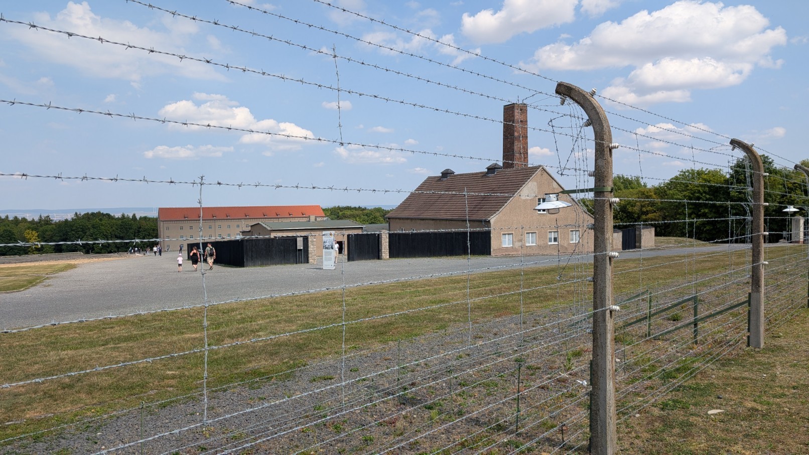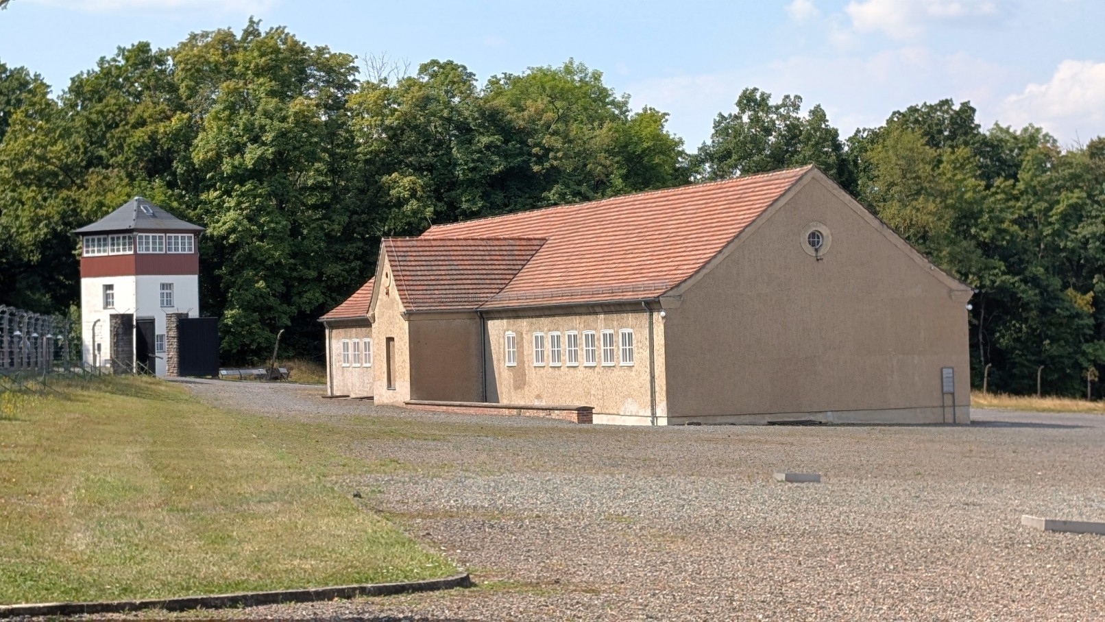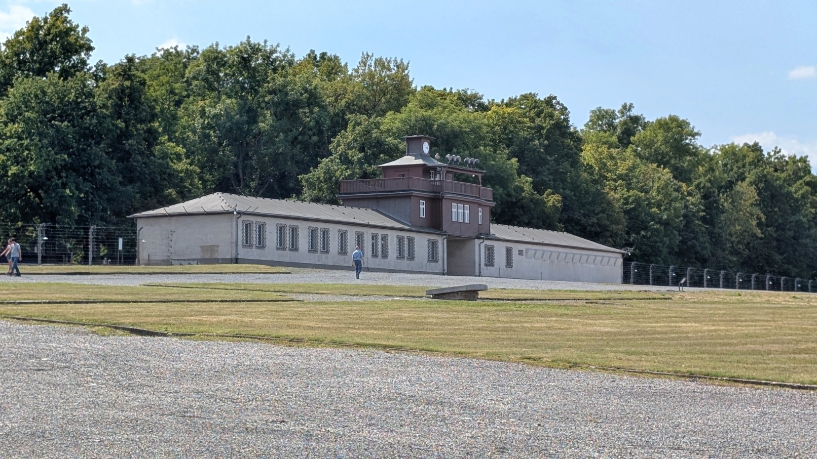 Das gesamte Lager war von einem rund drei Kilometer langen, elektrisch geladenen Stacheldrahtzaun umschlossen, der jede Flucht nahezu unmöglich machte. Im Abstand von jeweils etwa 100 Metern erhoben sich 23 massive Wachtürme, von denen aus SS-Wachposten das Gelände rund um die Uhr überwachten. Die Türme waren mit Maschinengewehren und Suchscheinwerfern ausgestattet, sodass der gesamte Lagerbereich permanent unter Feuer genommen werden konnte. Zusammen mit den Sperrzonen und dem Zaun bildeten sie ein lückenloses Sicherungssystem – Sinnbild für die totale Kontrolle und permanente Bedrohung, die den Alltag der Häftlinge prägte.