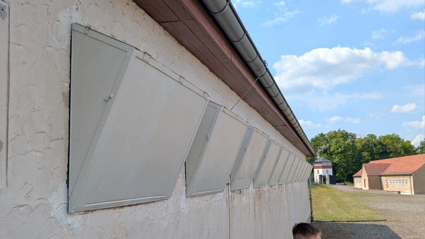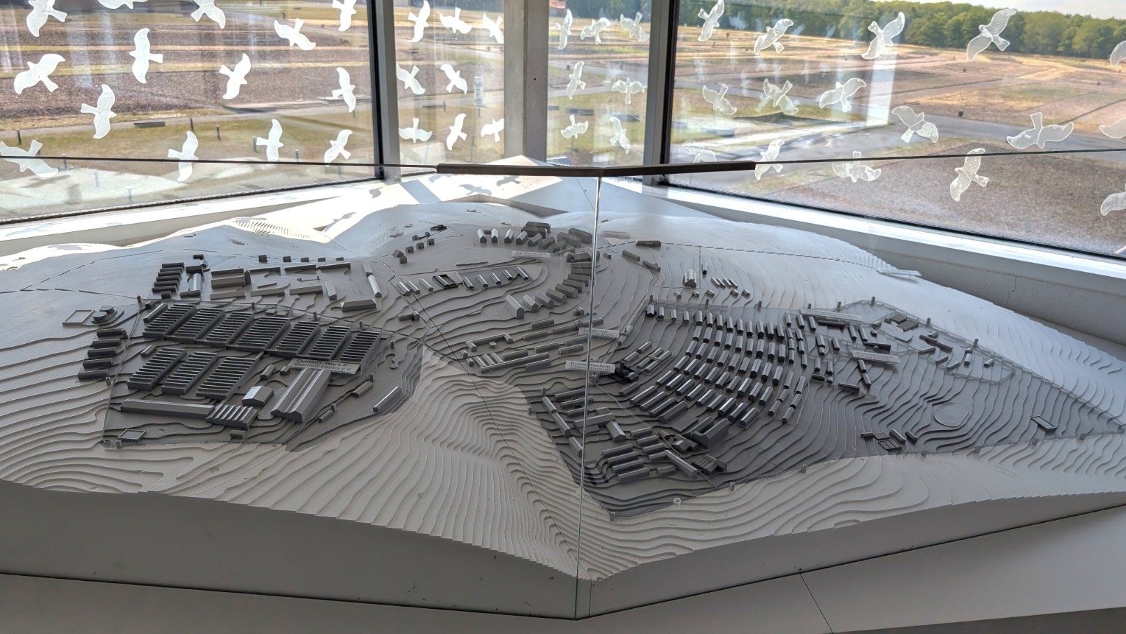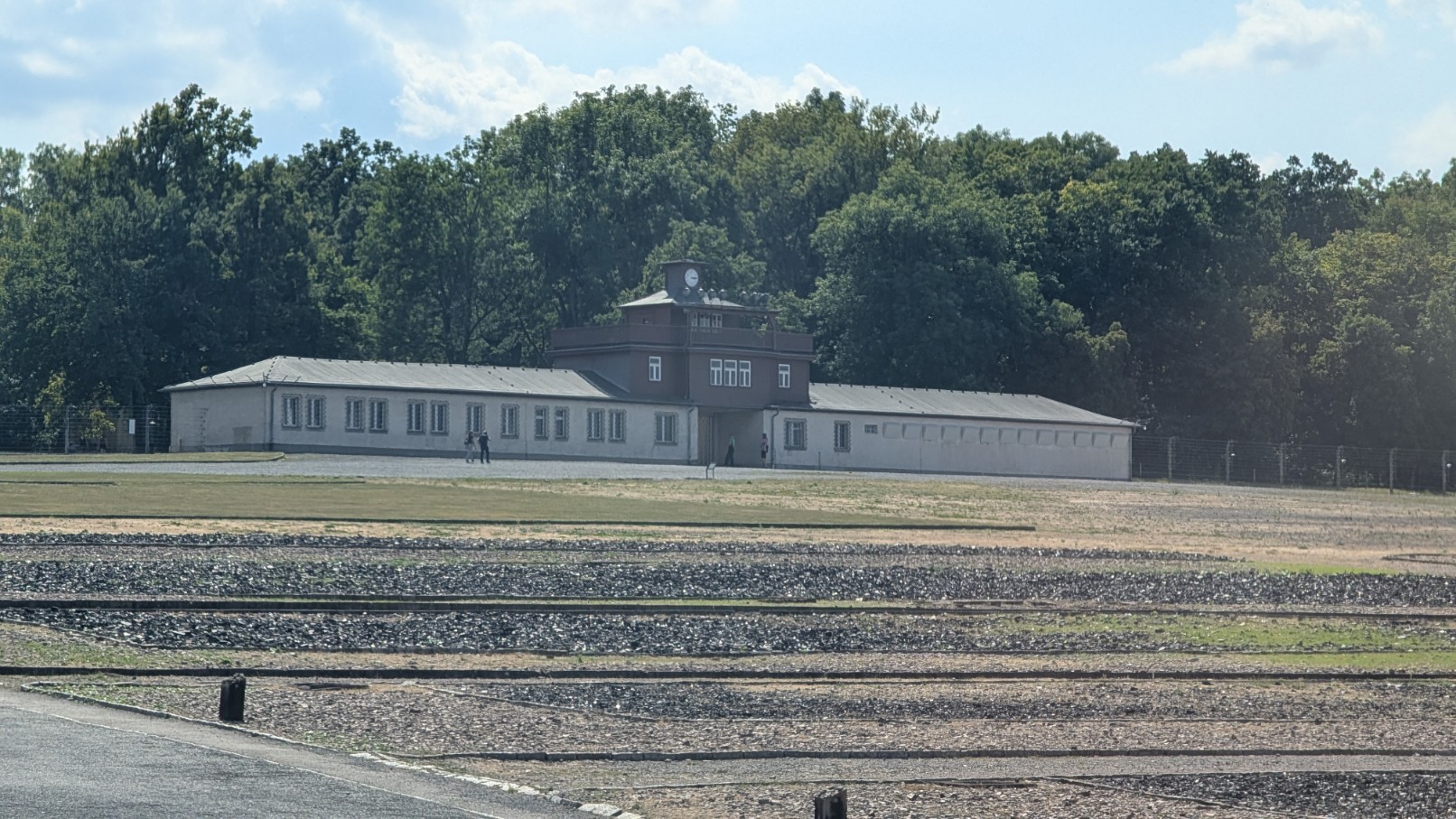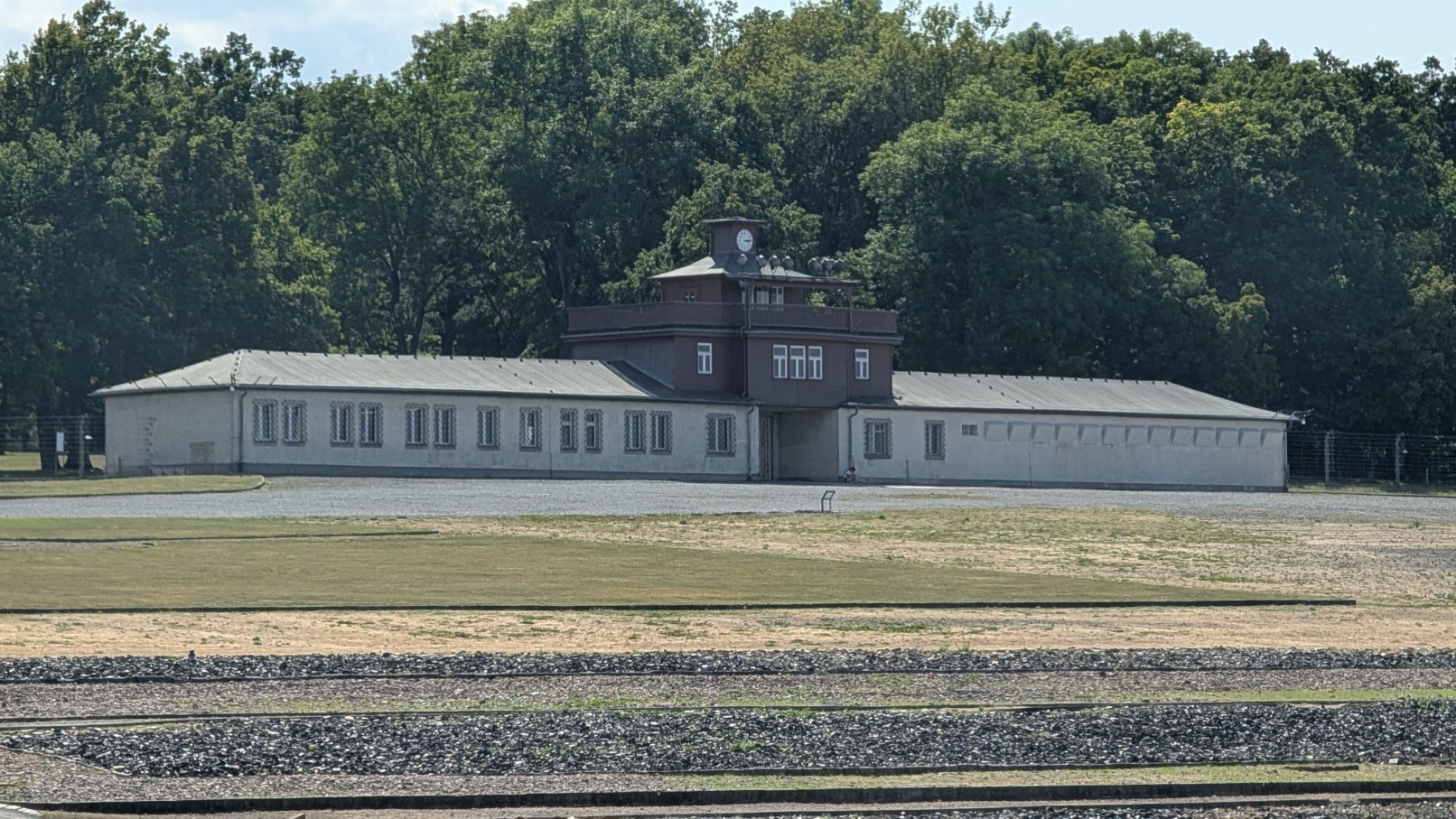 Das gesamte Lager war von einem rund drei Kilometer langen, elektrisch geladenen Stacheldrahtzaun umschlossen, der jede Flucht nahezu unmöglich machte. Im Abstand von jeweils etwa 100 Metern erhoben sich 23 massive Wachtürme, von denen aus SS-Wachposten das Gelände rund um die Uhr überwachten. Die Türme waren mit Maschinengewehren und Suchscheinwerfern ausgestattet, sodass der gesamte Lagerbereich permanent unter Feuer genommen werden konnte. Zusammen mit den Sperrzonen und dem Zaun bildeten sie ein lückenloses Sicherungssystem – Sinnbild für die totale Kontrolle und permanente Bedrohung, die den Alltag der Häftlinge prägte.
