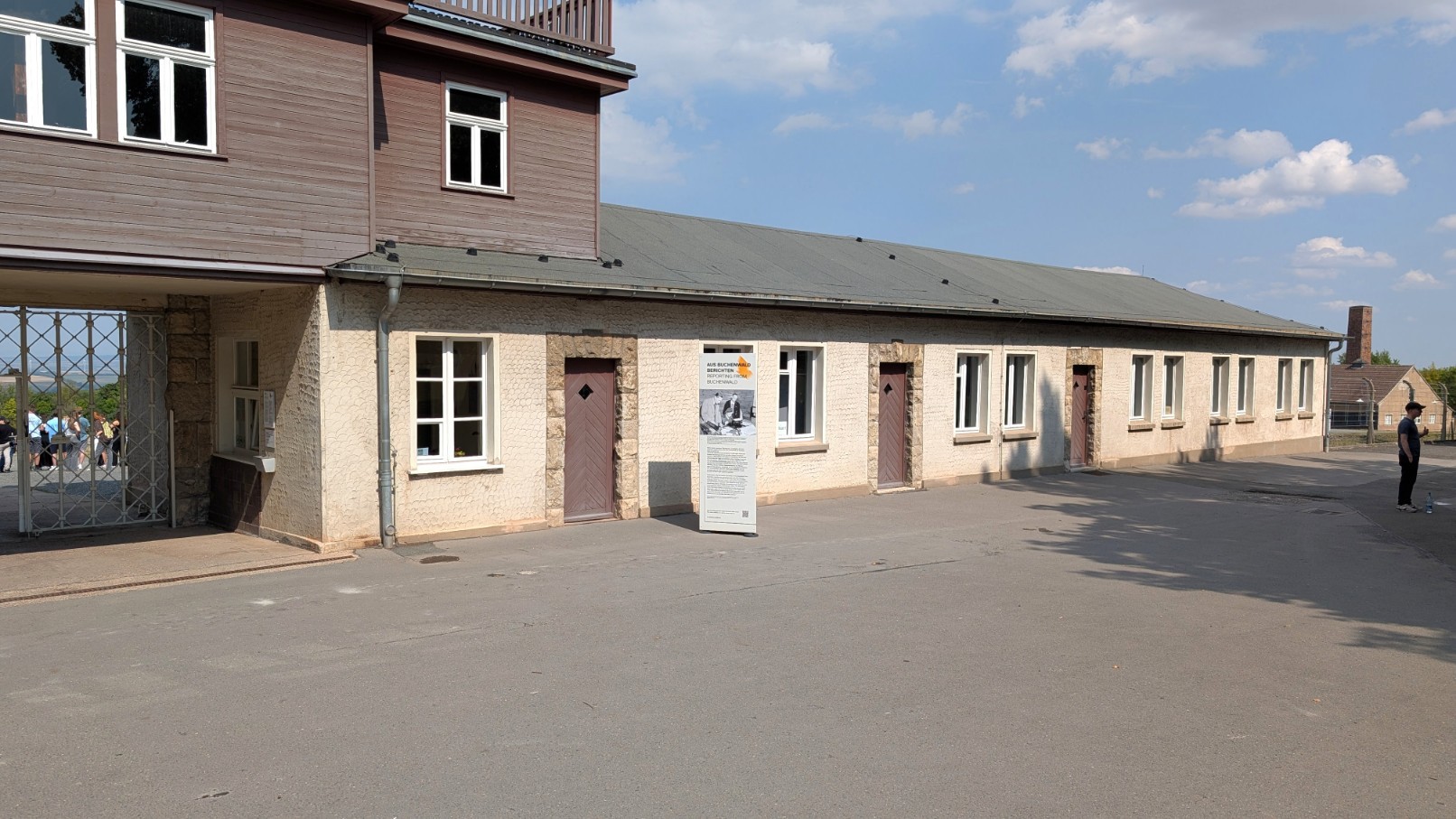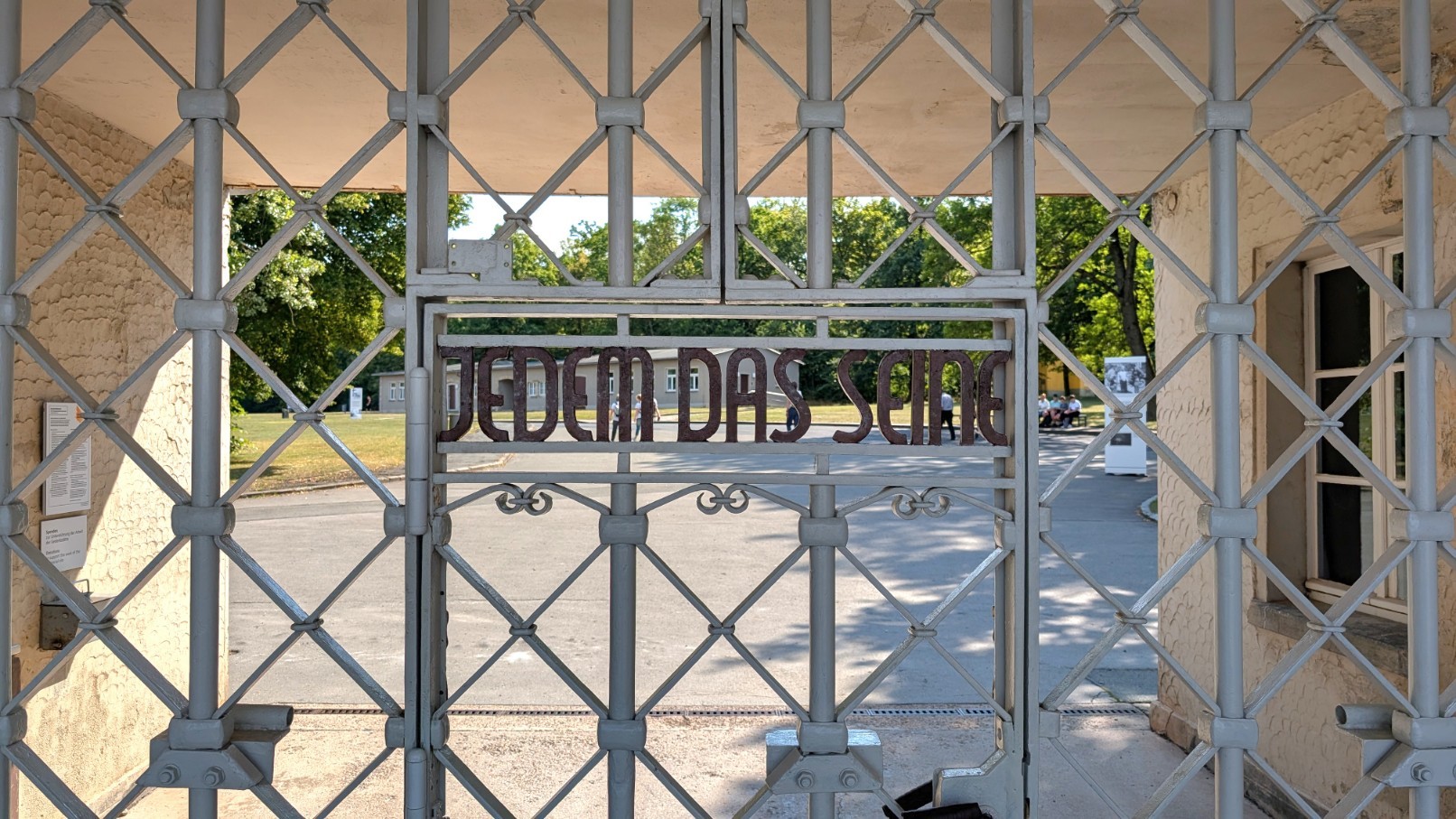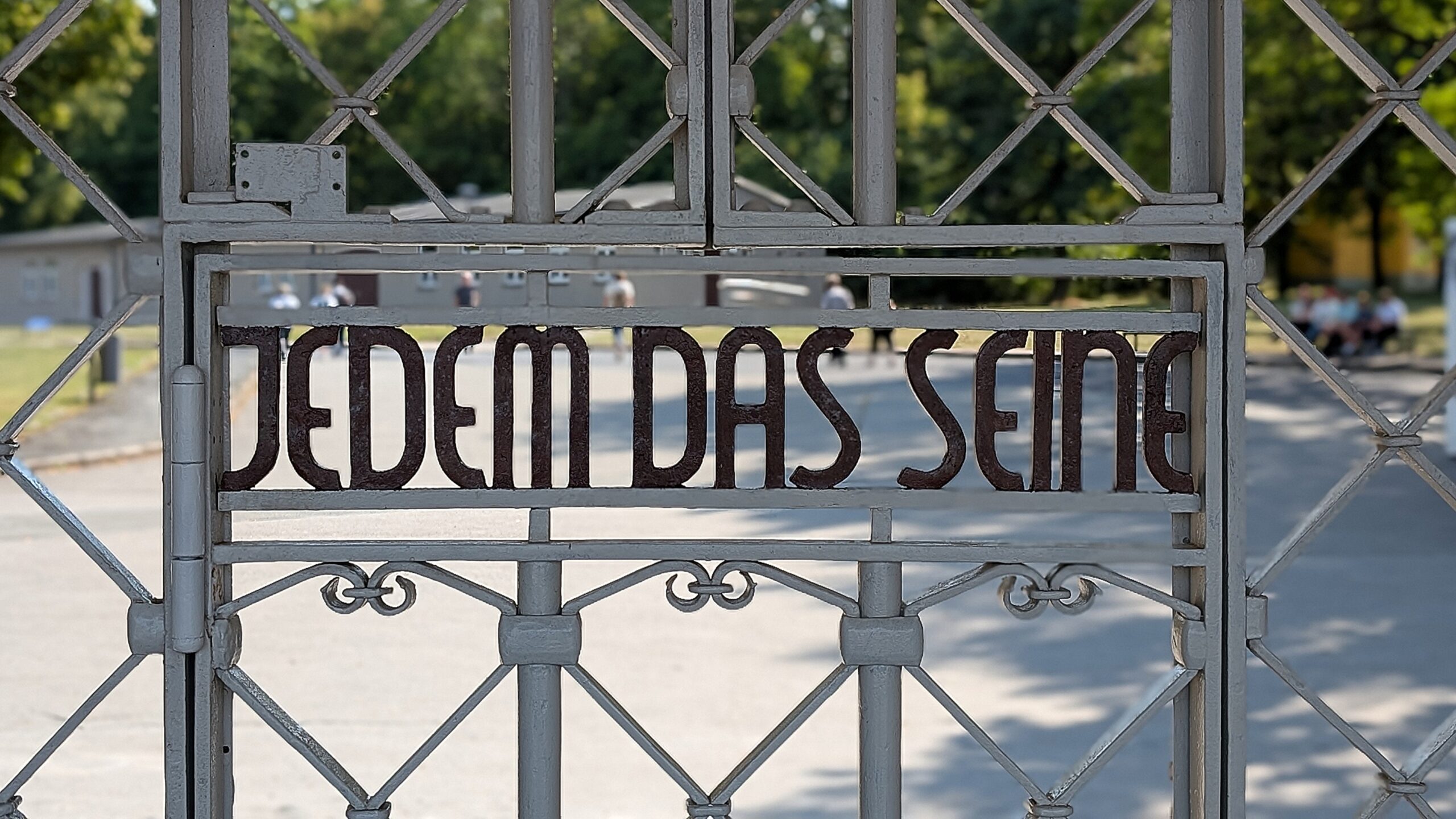 Das eigentliche Häftlingslager war wie eine Festung konzipiert: Ein rund drei Kilometer langer, elektrifizierter Stacheldrahtzaun markierte die äußere Grenze, verstärkt durch Sperrzonen und Minenfelder. Im Abstand von etwa 100 Metern ragten 23 Wachtürme empor, ausgestattet mit Maschinengewehren und Scheinwerfern, sodass es faktisch keinen toten Winkel gab. Wer sich dem Zaun näherte, riskierte sofort erschossen zu werden. Das Haupttor bildete den einzigen offiziellen Zugang. Von hier öffnete sich der Blick unmittelbar auf den zentralen Appellplatz, auf dem die Gefangenen stundenlang antreten mussten – oft bei jedem Wetter, manchmal bis zur völligen Erschöpfung. Über dem Torgebäude prangte der in Eisen geschmiedete Schriftzug „Jedem das Seine“. Der zynische Spruch war so angebracht, dass er allein für die Häftlinge von innen lesbar war – eine perfide Machtdemonstration, die die tägliche Demütigung und Entwürdigung in Buchenwald unterstrich.