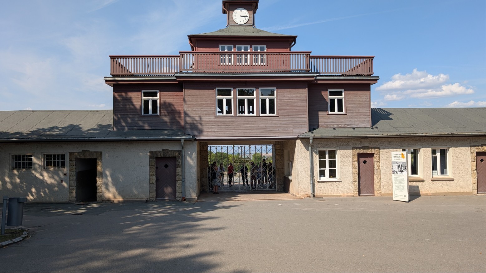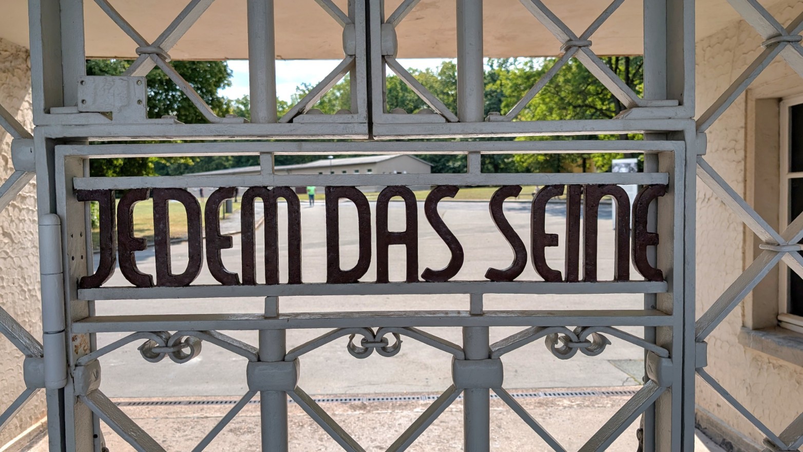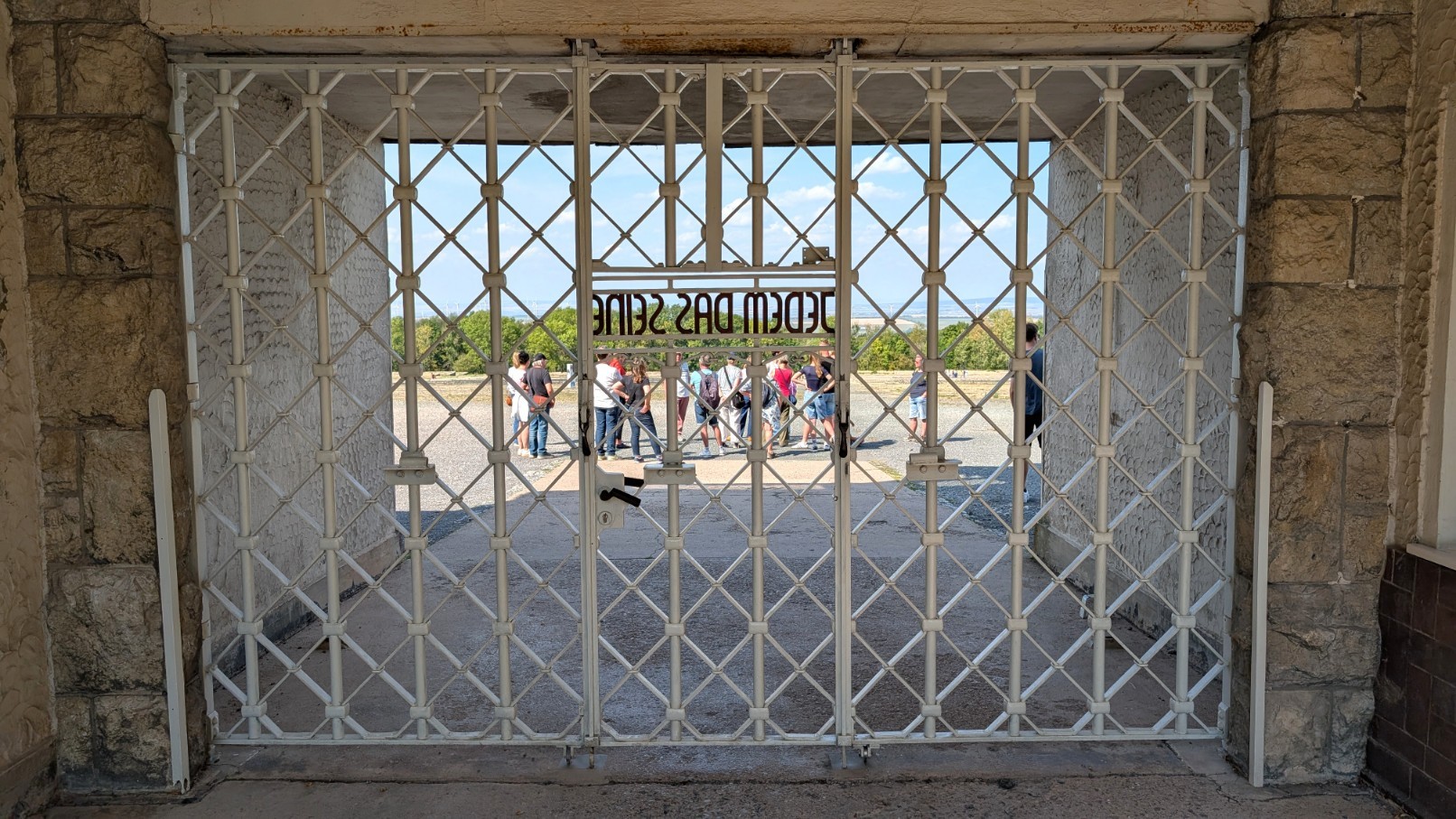 Das eigentliche Häftlingslager war wie eine Festung konzipiert: Ein rund drei Kilometer langer, elektrifizierter Stacheldrahtzaun markierte die äußere Grenze, verstärkt durch Sperrzonen und Minenfelder. Im Abstand von etwa 100 Metern ragten 23 Wachtürme empor, ausgestattet mit Maschinengewehren und Scheinwerfern, sodass es faktisch keinen toten Winkel gab. Wer sich dem Zaun näherte, riskierte sofort erschossen zu werden. Das Haupttor bildete den einzigen offiziellen Zugang. Von hier öffnete sich der Blick unmittelbar auf den zentralen Appellplatz, auf dem die Gefangenen stundenlang antreten mussten – oft bei jedem Wetter, manchmal bis zur völligen Erschöpfung. Über dem Torgebäude prangte der in Eisen geschmiedete Schriftzug „Jedem das Seine“. Der zynische Spruch war so angebracht, dass er allein für die Häftlinge von innen lesbar war – eine perfide Machtdemonstration, die die tägliche Demütigung und Entwürdigung in Buchenwald unterstrich.
