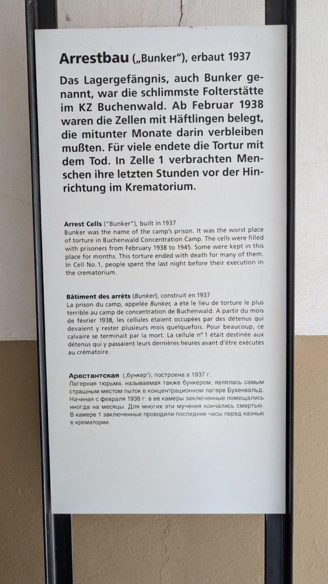 Die Strafpraxis in Buchenwald war brutal und systematisch. Sie reichte von Essensentzug über öffentliche Prügelstrafen bis hin zu sadistischen Foltermethoden. Besonders gefürchtet war das sogenannte „Baumhängen“, eine Form des Hängefesselns, bei der Gefangene mit auf dem Rücken gefesselten Armen an Bäumen oder Pfosten hochgezogen wurden – oft rissen dabei Sehnen und Gelenke. Der berüchtigte Arrestzellenbau, von den Häftlingen nur „Bunker“ genannt, galt als Ort des Schreckens: Hier wurden Gefangene nicht nur isoliert, sondern auch gefoltert und vielfach ermordet.