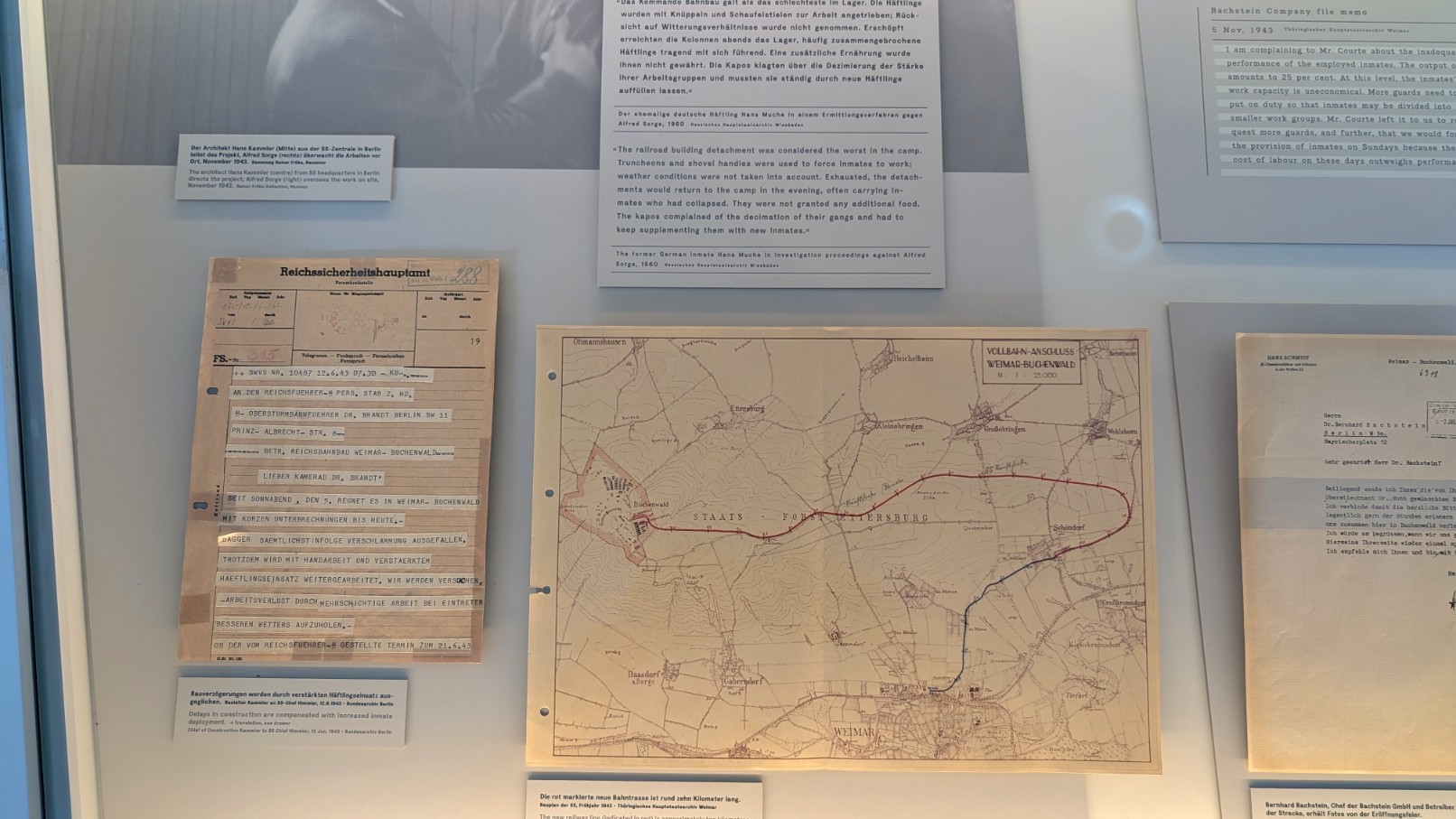 Spätestens ab den Jahren 1942/43 wandelte sich Buchenwald von einem reinen Haft- und Terrorort zu einem wichtigen Arbeits- und Rüstungszentrum im nationalsozialistischen Kriegssystem. Unter dem Druck des zunehmenden Arbeitskräftebedarfs wurden Häftlinge in großem Umfang zur Zwangsarbeit herangezogen. Im Rüstungsbetrieb Gustloff II in Weimar sowie in den Werkstätten der Deutschen Ausrüstungswerke (DAW) mussten Tausende Gefangene Waffen, Munition und Ausrüstungsgegenstände herstellen – unter Bedingungen, die Hunger, Krankheit und Erschöpfung systematisch verschärften. Um die logistische Anbindung zu verbessern, ließ die SS 1943 eine eigene Lagerbahn bis nach Weimar errichten, über die Materialtransporte ebenso liefen wie die Ankunft neuer Häftlingstransporte.